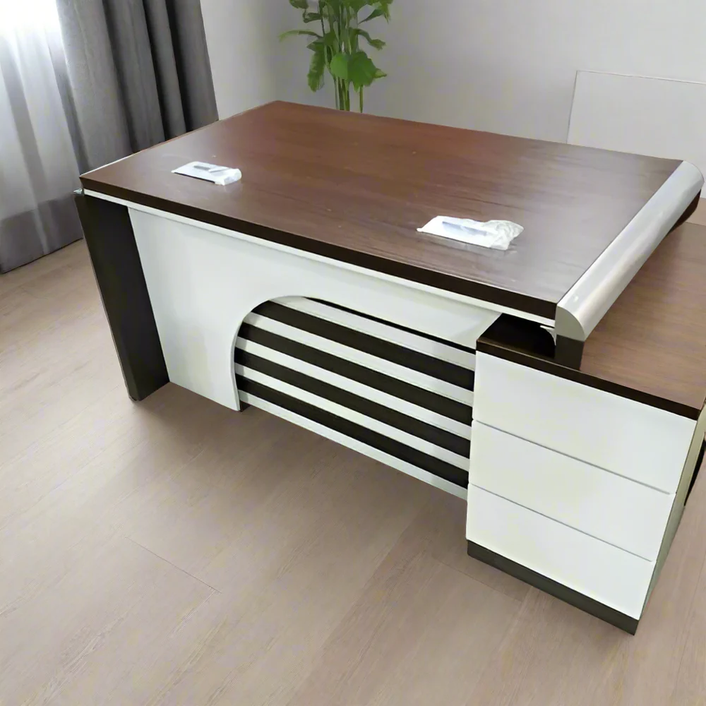 A 2-meter executive office table with extension is a large, 2-meter (approximately 6.5 feet) desk designed for leadership, featuring a spacious work surface that can expand via a detachable or integrated extension. This functional piece of furniture transforms a personal workstation into a collaborative area, ideal for meetings and projects, and is built with sturdy materials for stability. The executive design often includes sophisticated elements like refined finishes, potential cable management, and ample space for documents and equipment.